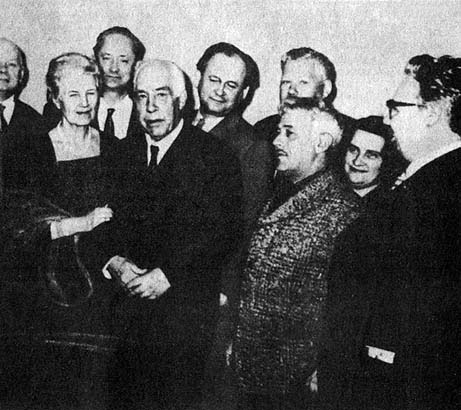Александр КАЗАНЦЕВ (справа) на встрече советских писателей с Нильсом БОРОМ (в центре). |