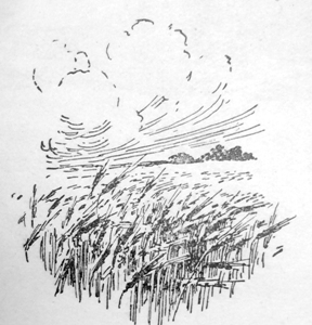 И пробегают к горизонту золотые волны, словно невидимая, ласковая рука проходит по морю спеющих хлебов, в которых там и тут синеют васильки.