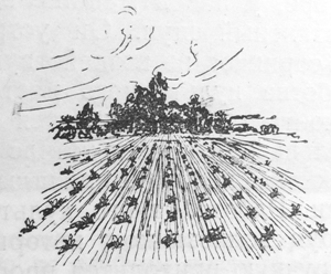 ...Старая борона с железными зубьями. Приснилась она ночью бедняку, у которого ничего, кроме нее, не было. Просит борона, чтоб бедняк оживил ее, и тогда сослужит она ему невиданную службу. Проснулся крестьянин и стал «оживлять» борону. Все дела забросил. Поле у него сорняками заросло, добрые люди над ним смеются, головами качают, а он все «оживляет» борону. Кузнеца позвал. Молотом бьет — звон по всему селу. Добрые люди в поле работают, спины гнут, свеклу да картошку пропалывают, а бедняк выехал в поле со своей бороной. Люди глядят, ухмыляются — бороновать-то сейчас не время. Да и надо же так борону изуродовать! Зубья не зубья, а гнутые лапы. Даже ступни у них, как у гусака, только заостренные. В землю лапы зарываются — и сорнякам конец. Проехал бедняк по своей полоске, и нет на ней больше сорняков. Лапы острые корни-жилы, как ножом, перерезают, — сорнякам и не подняться. Сбежался народ, дивуется. Лапы-то у бороны, гляньте, живые! Не только меж рядами идут, сорняки подрезают, но и в ряды просовываются, там сорняки приканчивают, да осторожно так, чтобы ботву не задеть. Дойдут до ботвы и сразу спрячутся, а потом снова высунутся. А бедняк кричит: «Давайте сообща жить! Борона моя простору просит! Стирайте межи, я вам все поля прополю, спину гнуть не будете».