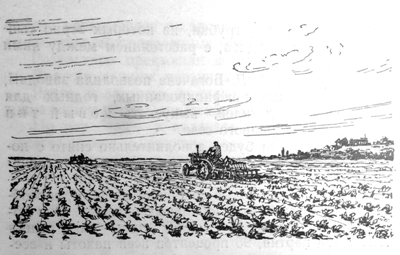 ...Передо мной испытываемая машина. Она похожа на двуколку. Сзади — ящик с картофелем. На запятках стоит инженер, следя за работой машины, выполняющей все операции самостоятельно.