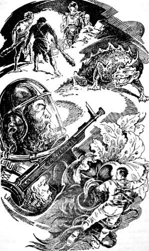 Один из них бросил в разверстую зубастую пасть моток колючих лиан. Зверь в ярости проглотил моток и стал бросаться из стороны в сторону. От боли, страха и бешенства ящер взвивался на привязанном хвосте, огромное его тело отделялось от болота, и все четыре когтистые лапы рассекали воздух.