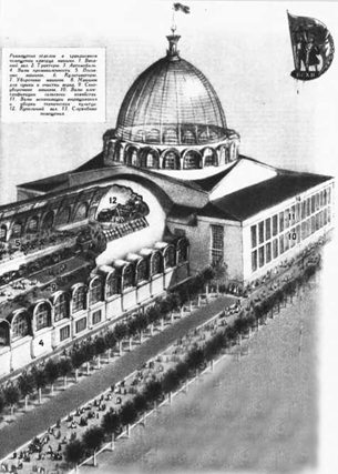 Центральный круглый зал под стеклянным куполом. Две расположенные одна против другой карты рассказывают, как электрифицировано наше сельское хозяйство и как разместились по всей стране 9 тысяч машинно-тракторных станций. Наглядно ощущаешь грандиозные сдвиги, произошедшие за годы советской власти в деревне. А ведь сегодняшние итоги — это только этап нашего движения вперед. А что будет через пять, через десять лет? Попробуем представить себе этот зал выставки через несколько лет.