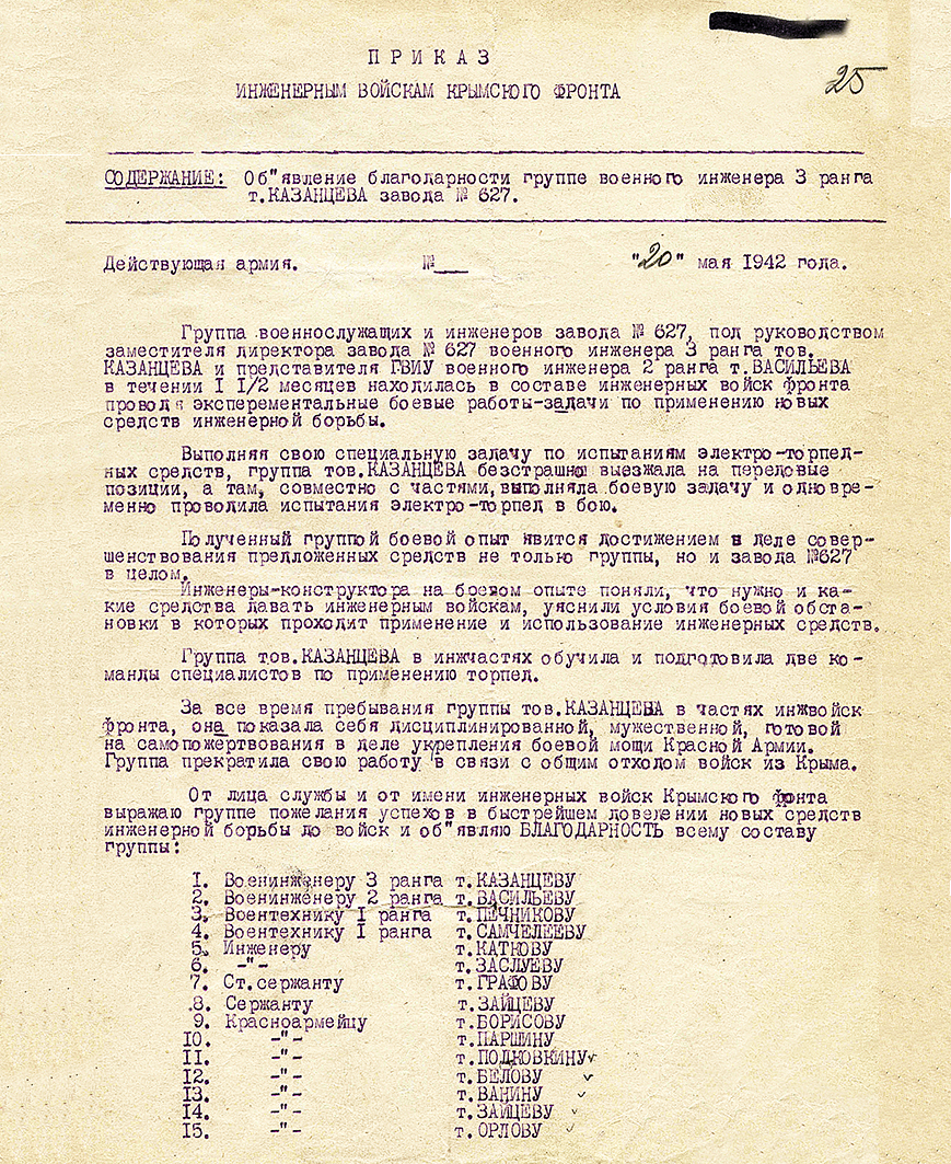 В глубоком сыром окопе, где сапоги хлюпали в лужах от вчерашнего дождя, военинженер III ранга Званцев приник к телескопической стереотрубе, верхняя часть которой поднималась над бруствером. В тумане сумерок едва различались далекие нефтяные баки Феодосии. Красная Армия вплотную подошла к ней, отбив у гитлеровцев Керченский полуостров. Званцев возглавлял особую группу Главного военно-инженерного управления, испытывая в боевых условиях изобретенные им сухопутные электроторпеды.