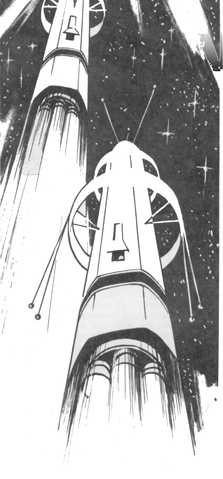 Росов сближался с первой группой ракет. Теперь они были видны в переднем иллюминаторе. Две из них походили на крохотные серебристые месяцы, две другие — на продолговатые звездочки.