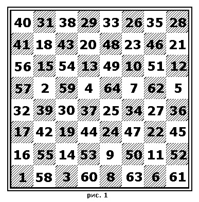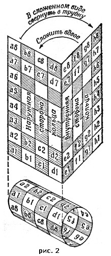 – Итак, мудрый мой друг, "насик" готов наполовину. Не составит труда заполнить и оставшиеся поля. Тогда он отразит бесконечные законы математики. – Бесконечные? – удивился Рерих. – Он и сам станет бесконечным, как Вселенная, надо лишь уподобить его кругу, чтобы он соприкасался сам с собой всеми своими сторонами. – Как это может быть? – Очень просто. Сложи квадрат пополам по вертикальной линии между рядами "d" и "е". Полученную полоску с квадратиками полей сверни трубкой (рис. 2) – Я смотрел на твой перстень, Учитель, и нарисовал его с цифрами на нанесенных квадратиках. – Если бы ты на самом деле увидел на моем перстне цифры, ты принял бы его за талисман? Так знай: суеверие хуже религии, которая хоть в первоначальной форме основывалась на сотворении добра другим. Суеверие служит лишь для тебя самого. – Ты поистине мудр, махатм! – Я лишь тень нашей мудрости, обратившаяся к твоему народу со словами: "Привет вам, ищущим общего блага". И он ушел, оставив Рериха размышлять обо всем услышанном. Ушел, легко перепрыгивая с камня на камень, взбираясь все выше и выше, пока не скрылся исчезающей тенью в тумане, который со дна ущелья казался облаком. На этом закончилась вызванная моим воображением картина, следствие которой, если хотите,, можно рассматривать как гипотезу о чудесном математическом квадрате, что получается с помощью шахматных фигур. Мы с Михаилом Николаевичем достроили его, заглядывая в старую тетрадь и подсчитывая суммы цифр вдоль и поперек, яростно щелкая на счетах, как заправские кассиры. – Ну и что? – спросил я, откидываясь на спинку стула, – бухгалтерия ясна. Но при чем тут ваш алгоритм? А я ведь тайно жаждал реванша с неведомой алгоритмической "машиной". – Как при чем? – вспыхнул Михаил Николаевич. – Алгоритм вытекает из закономерностей, которые вы сейчас увидите. – Какая связь? – пожал я плечами. – Как вы не понимаете! – в отчаянии воскликнул Михаил Николаевич. Мне даже стало жалко моего энтузиаста. Я ведь прикидывался, будто не понимаю, а на самом деле не прочь был овладеть алгоритмом. Чтобы выиграть у любого партнера? Что со мной? Ведь я всегда ценил в шахматах процесс игры, ее красоту, а не результат! Зачем же этот антихудожественный алгоритм? И в состоянии внутренней борьбы узнавал я о преследованиях шахматной жар-птицы. – "Насик", – объяснял Михаил Николаевич, – обладает более совершенными свойствами, чем обычные магические квадраты.