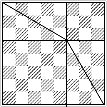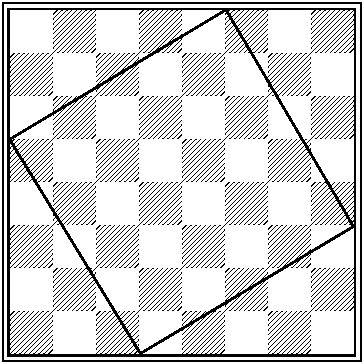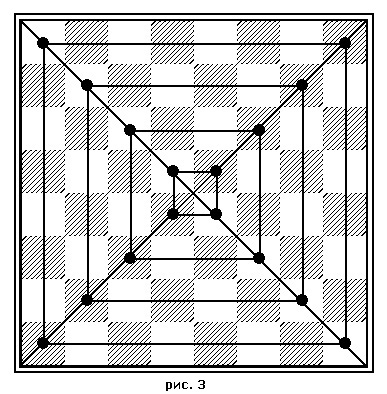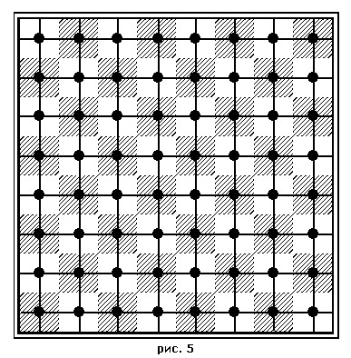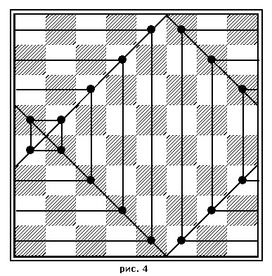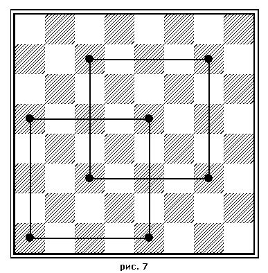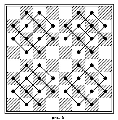 Самое интересное, что на "насик" можно нанести сетку прямоугольную (рис. 5) и сетку диагональную (рис. 6). В узлах, отмеченных на сетках, окажутся определенные цифры. Их сумма в любом квадрате из 2, 4, 6 и 8 полей в стороне всегда равна 130. Но есть еще особый случай: квадрат с пятью полями! (рис. 7) На первом ряду он отмечен полем е1 (на котором, заметим, поставлен белый король!). Это как бы золотое сечение: 5 полей и 3 поля слева и справа в горизонтальном ряду дают суммы два раза по 130! Такую же сумму 130 дают и узловые поля пятипольного квадрата, где бы он ни был расположен в "насике". Диагональная сетка выражена двумя прямоугольниками, - расположенными крест-накрест в каждой четверти (квадрата) "насика". Прямоугольники складываются из двух квадратов каждый.