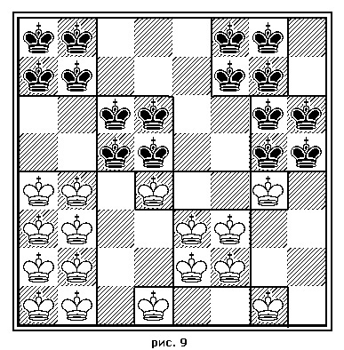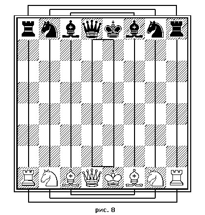 Отмеченные на них узлы приходятся на цифры, которые для каждого диагонального квадрата дают те же 130! – Преклоняюсь перед волшебством. Но при чем тут шахматы? – В том-то и дело, что не только шахматы. Сетка-то напоминает кристаллическую решетку! Но начнем с шахмат. С расстановки фигур (рис. 8). Цифры на полях a1, h1, a8 и h8 в сумме дают 130! Это для ладей! Но то же самое и для слонов: b1, f1, b8, f8, и для коней: b1, g1, b8, g8, и, наконец, для короля и ферзя суммы цифр опять будут 130! Все фигуры занимают целиком ряд с константой 260, точно так же, как и каждый из рядов пешек. – Случайность, – сделанным равнодушием заметил я. – Просто фигуры поставлены в ряд, где цифры подобраны. – Какая же это случайность, когда можно рассмотреть ходы фигур, а не только их первоначальное положение? Король! Вы же заметили, что каждые четыре поля в любом квадратике доски дают сумму цифр 130. А если поставить рядом два таких Квадратика, можно и со сдвигом на одну клетку (или даже на две)?