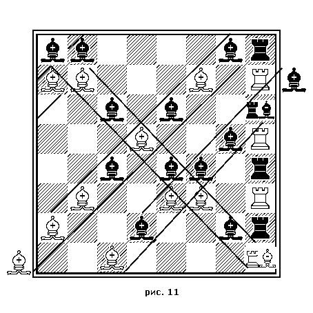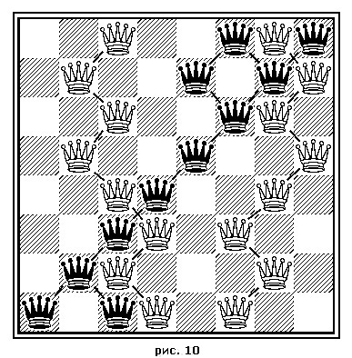 В восьми полях будет сумма 260! А что это за восемь полей (рис. 9)? Это же поля, которые может последовательно занять король при своих семи ходах! Так что и ему в движении присуща та же константа. Так ведь и с другими фигурами та же история! – Вы так думаете? – Знаю! Ферзь. Поставим его в угол на a1 (рис. 10). Восемь последовательных полей, которые он займет при семи ходах в одном направлении, дадут сумму цифр 260, как в полной диагонали. А если она спиральная, то начинать можно в любом месте "насика" и двигаться в любую сторону. Более того! Если ферзь начнет путешествовать по узлам диагональной сетки, похожей на кристаллическую решетку, то может обойти получившиеся фигуры так, чтобы пройти оба квадрата по восьми полям, что в сумме цифр опять даст 260. Может ферзь пройти и другими путями, которые видны на диаграмме. Ну как? – Совпадение.