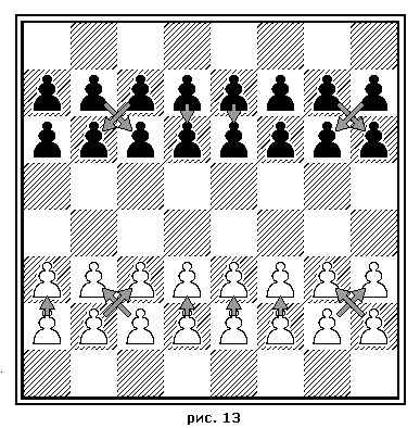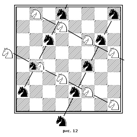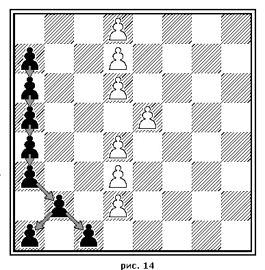 Теперь пешки! Выстроенные в ряд, они дают константу. Но если они передвинутся и две из них побьют в разные стороны, то новый ряд снова даст константу (рис. 13). Движение же центральной пешки (рис. 14) - d3-de-ed-d6-d7-d8 дает ту же сумму цифр 260. Или черная пешка а7. Она идет по полям а6-а5-а4-аЗ-Ь2, и теперь взятие или на а1 или на с1. В одном случае сумма цифр будет 259, а в другом 261. В среднем та же константа 260, хотя пешки проходят не восемь, а лишь семь полей. Я еще не признался, не произнес слово "чудо", но оно могло бы произойти, если бы Михаил Николаевич открыл тайну алгоритма. Но он не скрывал ее (если знал!). Увлеченный моей фантазией, он уверял меня, что махатм сказал Рериху много больше, чем я вообразил. Но этого не записано в дневнике.