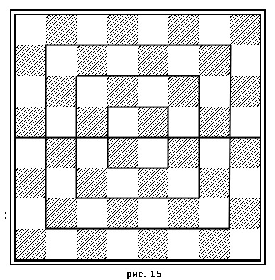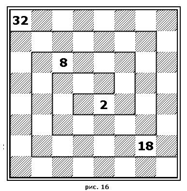 В поисках алгоритма я проверил все...все! "Сейчас проговорится!" - чуть ли не с опаской подумал я, не пропуская ни слова. – В "насике" не только вертикальные и горизонтальные ряды, но также и любые диагонали, так остроумно превращенные махатмом в спирали, дают сумму цифр восьми полей равную 260! Но это далеко не все! Вокруг центрального квадратика из четырех полей (рис. 3) можнопостроить квадраты из 16, 36 и, наконец, из 64 полей. И сумма цифр угловых полей на всех этих квадратах будет 130! И все это построение можно сдвинуть в любую сторону. Ничего не изменится! (рис. 4)