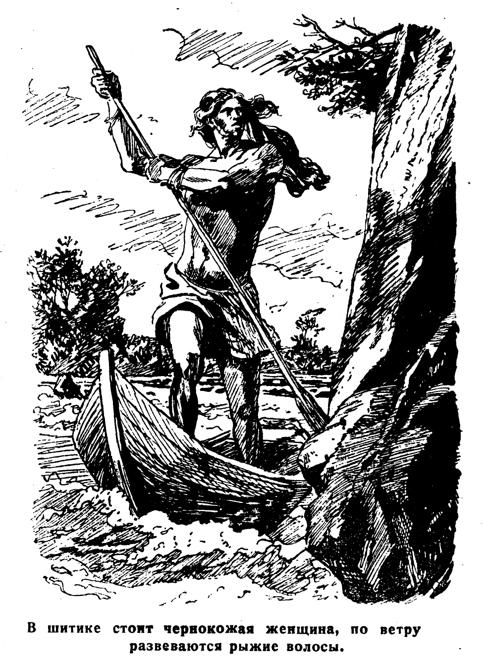 — Есть красочное описание встречи с ней ангарца-зверобоя Кулешова, — сказал спутник Сергея Антоновича, снимая очки, чтобы протереть их платком. Прищурившись, он посмотрел поверх меня куда-то вдаль. — Благодаря любезной настойчивости Сергея Антоновича я выучил его наизусть. Представьте себе: рев, грохот и черные мокрые камни среди белой пены. Почти шаркая о нависшие с берегов скалы, меж камней скачет шитик - лодка с поднятыми бортами. Высоким носом шитик зарывается в пену. В нем стоит чернокожая женщина. На ней только набедренная повязка. По ветру трепещут, развеваются длинные рыжие волосы. Кулешов готов был поклясться, что она гигантского роста. Лица ее он не рассмотрел. Охотник говорил, что она шаманит у стариков. Через перекат переправлялась она без одежды, вероятно боясь в ней утонуть.