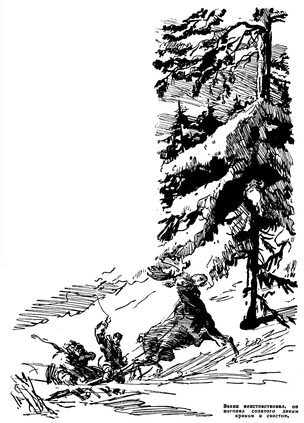Когда-то я слышал, что лоси бегают со скоростью восьмидесяти километров в час. Но ощущать это самому, судорожно держась за сани, чтобы не вылететь... Видеть проносящиеся, слитые в мутную стену пожелтевшие лиственницы... Щуриться от летящего в глаза снега... Нет, я не могу вам передать ощущения этой необыкновенной гонки по тайге! Эвенк неистовствовал. Он погонял сохатого диким криком и свистом. Комья снега били в лицо, словно была пурга. От ураганного ветра прихватывало то одну, то другую щеку.