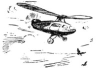 Вскочив, Андрей сорвал с себя мягкую широкополую шляпу и, надев ее на посох, стал яростно им размахивать. Теперь можно было отчетливо рассмотреть летательный аппарат. Он был без крыльев. Жужжание, вероятно, вызывалось огромным горизонтальным винтом, расположенным над фюзеляжем и вращавшимся так медленно, что можно было легко рассмотреть его лопасти. Пропеллер, расположенный на хвосте, тянул не вдоль фюзеляжа, а перпендикулярно. По-видимому, он компенсировал реакцию от вращающихся белых лопастей.