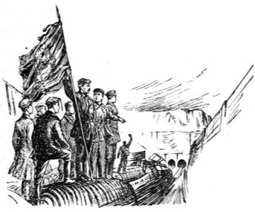 Коля оглянулся и увидел повсюду головы людей, флаги, плакаты. Грянул оркестр. Ребята спрыгивали с платформы и бежали рядом с поездом. Коля тоже спрыгнул и едва не растянулся на перроне. Побежав рядом с поездом, он поглядывал на толпу, стараясь угадать, какое на нее производит впечатление его картина. Коля прибавил ходу, чтобы догнать платформу, на которой был виден Никифор Иванович, с торжественной суровостью державший развернутое знамя — дар белорецких рабочих. Вдруг он остановился, словно налетев на столб.