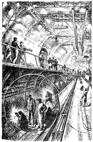 Действительно, весь сборочный зал наполнился блестящими полосами рельсов, подхваченных электромагнитами. Звеня о стенки свариваемого туннеля, рельсы стали спускаться на дно, где их направляли сотни рук.