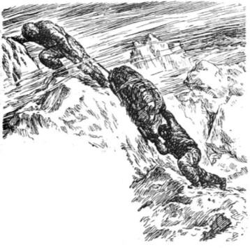 Дубакин уже ползет на четвереньках, но все же тянет полуразвалившиеся сани. Наверху он ложится отдыхать. Чувствуя, что веревка ослабла, он хочет подтянуть ее, но руки не поднимаются.