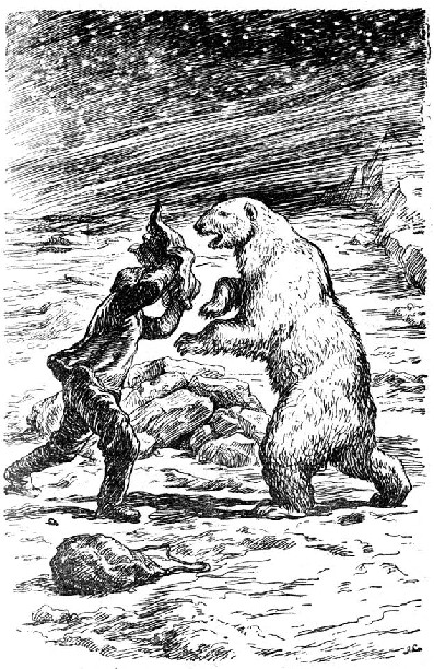 Медведь приближался, глухо рыча. Ловким движением Андрей сбросил свой тюк и вытащил холстину; кусочки мяса рассыпались по снегу. Медведь приближался. В мгновенье опорожнив пузырек, держа перед собой тряпку, человек смело пошел навстречу медведю.