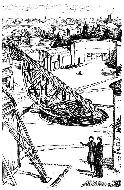 Однорельсовая железная дорога около станции «Ракетная» проходила у самой территории Ракетного института. С высоко поднятых над землей ферм был отчетливо виден двор института, длинные здания с арочными стеклянными перекрытиями и странное решетчатое сооружение, поднимавшееся с середины двора в небо. Все фермы однорельсового пути были усеяны мальчишками, неизменными свидетелями всех значительных или незначительных событий во всем мире, во все времена.
