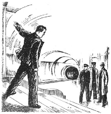 Поезд неподвижно стоял в шлюзе. Механизмы закрывали люк в туннель. В неудобной, деревянной позе Степан сидел перед пультом, держа руку на рукоятке контроллера малого мотора, предназначенного для небольших скоростей. Если главный мотор сгорел, то этот, во всяком случае, был невредим. Быстрым движением Степан смахнул со лба капельки пота. Перед его глазами медленно опускался последний люк. Сначала он увидел мозаику свода американского подземного вокзала, потом замелькали подбрасываемые шляпы. Вот и машущие руки, головы, открытые рты...