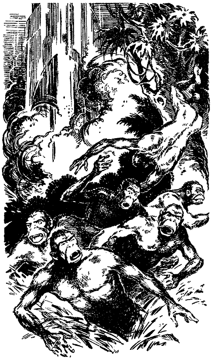 И вдруг под гладким каменным деревом, в котором скрылись один и другой безволосые, загромыхал такой страшный гром, что даже самые свирепые самцы свалились с веток. А потом из-под гладкого дерева повалили черные тучи, как перед водой, падающей сверху, и засверкал бьющий огонь.