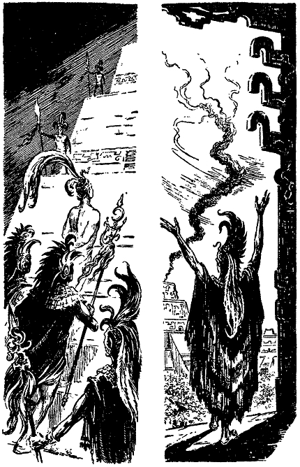 – Ничтожный заступник тех, кто чтит богов, умолял бога Неба смилостивиться над людьми Толлы, он обещал ему богатую жертву в десять тунов горячих сердец. Но как слабому жрецу, бескорыстно любящему людей Толлы, выполнить это обещание? Доблестные воины Толлы ныне сладко отдыхают на коврах из птичьих перьев и пьют дурманящую пульке, погружаясь в «калан». Недостойный жрец решил призвать десять раз по двадцать юношей, чтобы они добровольно отдали свои сердца богу Неба, спасая тем свой народ от великих несчастий. Пусть прекрасные юноши сейчас же взберутся на первую ступень пирамиды, и завтра в полдень, когда солнце заглянет сквозь священное отверстие в крыше храма, чтобы полюбоваться подвигом героев, они один за другим взойдут на жертвенный камень, переходя с него на небесную твердь.